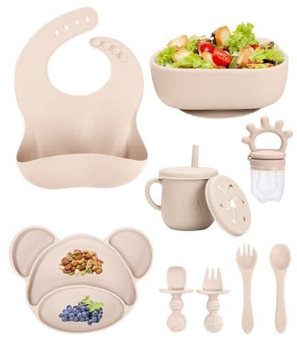 Assiette à pour Bébé Silicone,10 pièces de Assiette Ventouse Pour Bébé,bol, bavoir, couvert bebe, fourchette, gobelet pour bébé 2 en 1, gobelet à goûter, tétine à fruits pour bébés (beige)