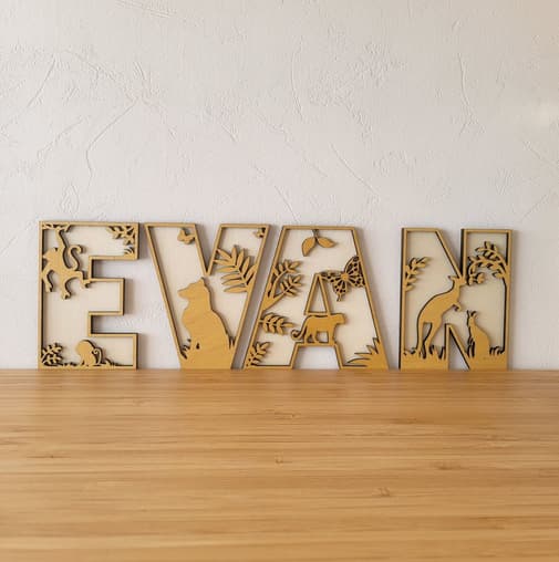 Lettres en bois 3D pour prénom. Thème et couleur au choix animaux jungle savane dinosaure licorne planete forêt chien etc ...