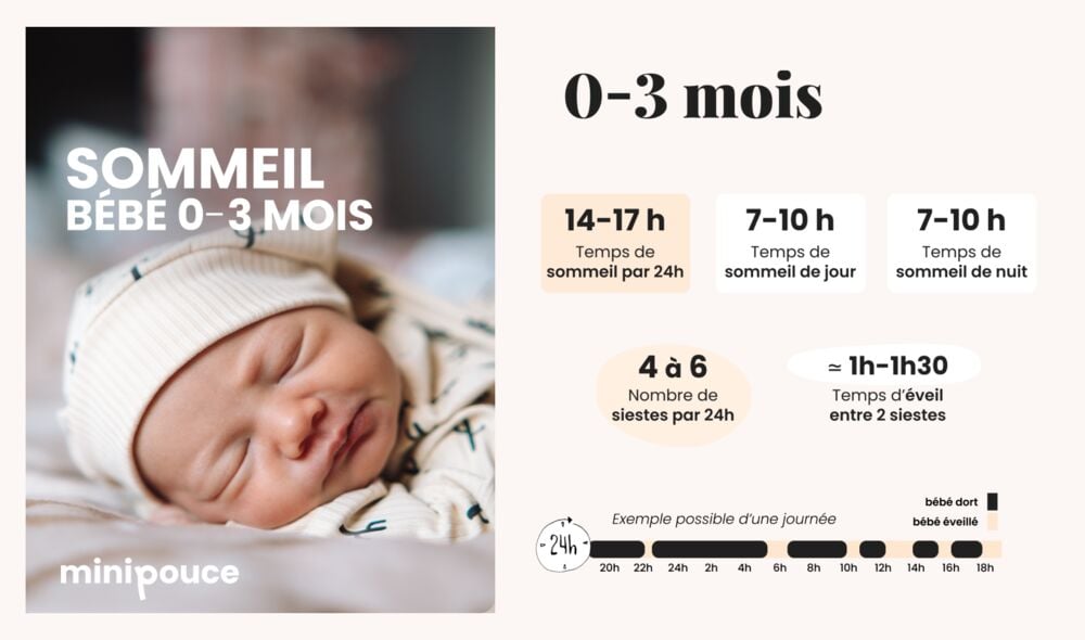 | 0-3 mois | 14-17 h | 4 à 6 | 7-10 h | 7-10 h | Siestes irrégulières, sans horaire fixe. Endormissements fréquents après les tétées ou biberons. Temps d’éveil courts. | Ne distingue pas le jour et la nuit avant 8-10 semaines. Les périodes de sommeil sont donc entrecoupées de temps d’éveil et d’alimentation. |