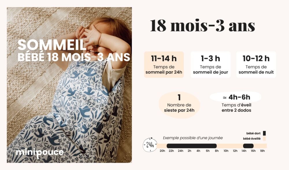 | 18 mois – 3 ans | 11-14 h | 1 | 1-3 h | 10-12 h | Une seule sieste l’après-midi, certains enfants peuvent la refuser à terme (mais leur besoin de repos total reste le même). | Le sommeil de nuit est généralement continu et de durée régulière. |