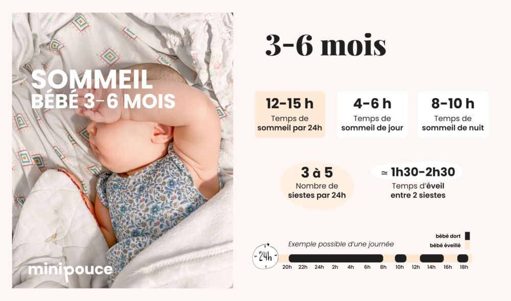 | 3-6 mois | 12-15 h | 3-5 | 4-6 h | 8-10 h | Le rythme jour/nuit est installé, les siestes deviennent un peu plus longues. À 6 mois, le bébé fait en moyenne 3 siestes. | Le bébé distingue la nuit et le jour et allonge son temps de sommeil de nuit. Les réveils nocturnes restent fréquents. |