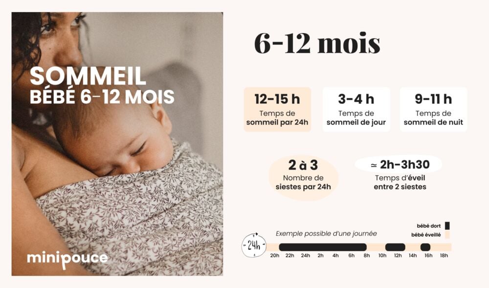 | 6-12 mois | 12-15 h | 2-3 | 3-4 h | 9-11 h | La sieste de fin de journée disparaît aux alentours de 8 mois. Davantage de régularité dans les horaires. | Les réveils nocturnes peuvent devenir moins fréquents ou disparaître. |