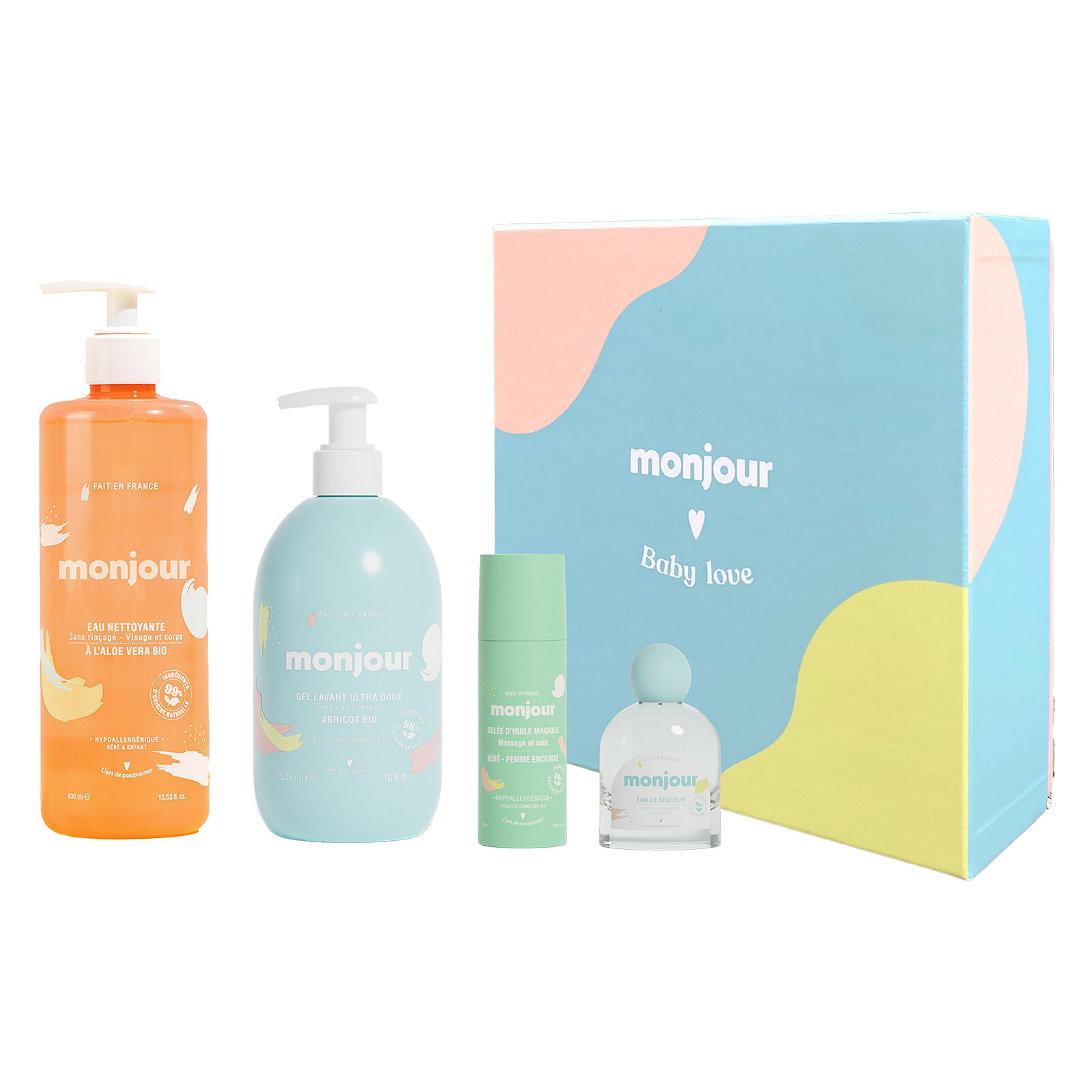 Monjour se compose de quatre produits qui apporteront une touche de douceur au quotidien : le